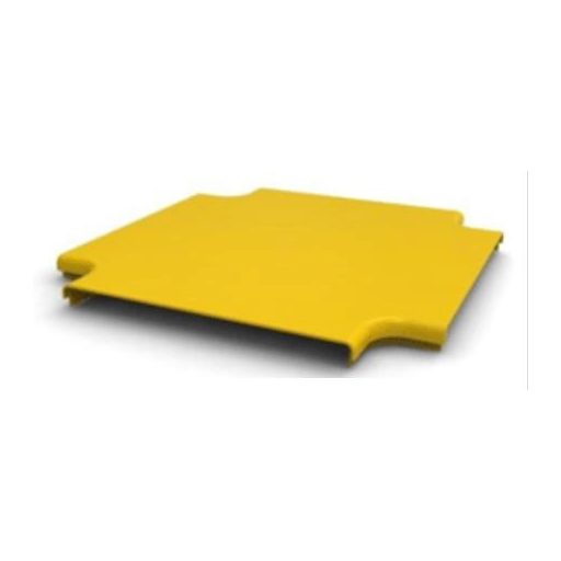 300x100mm-es optikai kábelcsatorna rendszerhez az egyenes csatorna elemek 4 irányú toldó idom fedő eleme RAL 1021-es sárga színben.